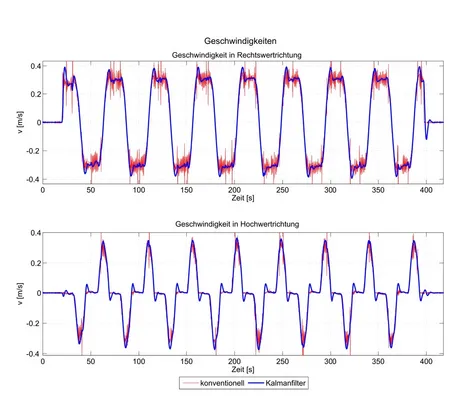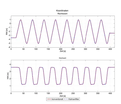 Die am besten geeignete Variante des Kalman-Filters wird anschließend mit verschiedenen Bewegungen auf ihre Leistungsfähigkeit hin untersucht. Dazu werden unter anderem die Bewegungen einer LGB-Bahn auf einem Gleisoval, eine Pendelbewegung, eine Bewegung mit Stillstandsphasen und eine Bewegung mit hoher Geschwindigkeit (nahe der vom Tachymeterhersteller vorgegebenen Maximalgeschwindigkeit für den Trackingmodus) untersucht, mit dem Ergebnis, dass alle Bewegungsabläufe zuverlässig gefiltert werden können. Beispielhaft werden an dieser Stelle die Ergebnisse der Filterung der Bewegung der LGB-Bahn dargestellt.