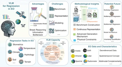Earth observation (EO) data encompass a vast range of remotely sensed information, featuring multisensor and multitemporal data, playing an indispensable role in understanding our planet’s dynamics. Recently, vision–language models (VLMs) have achieved remarkable success in perception and reasoning tasks, bringing new insights and opportunities to the EO field. However, their potential for EO applications, especially for scientific regression-related applications, remains largely unexplored. This study systematically explores the feasibility and limitations of applying VLMs to predict continuous environmental variables such as biomass, soil moisture, and land surface temperature. Moving beyond perception-oriented tasks like captioning and visual question answering, the work identifies four fundamental challenges: benchmark scarcity, representation mismatch between discrete and continuous spaces, cumulative numerical prediction errors, and misaligned training objectives. Methodological pathways and benchmarking principles are outlined to guide future model development, while remaining gaps in evaluation, reliability, and uncertainty quantification are highlighted as key directions for subsequent research, along with multistep, multitemporal, and multidomain regression. Overall, the study establishes a conceptual and technical foundation for developing robust, interpretable, and trustworthy VLMs in EO, paving the way for the next generation of scientific AI to monitor our changing planet.