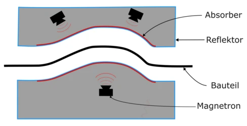 The core of the project is the development of a material for microwave absorption and another material for microwave reflection. To this end, several polymer matrices with relevant filler materials are strategically combined and evaluated. The complex permittivity at 2.45 GHz is considered the key evaluation criterion for these materials. Subsequently, design guidelines will be derived in line with design for additive manufacturing. These include the required thicknesses of the absorber and reflector layers, the positioning of the magnetrons, and measures to optimize heat capacity as well as cooling and heating times. The results will then be demonstrated using an application example from HL Kunststofftechnik GmbH.
