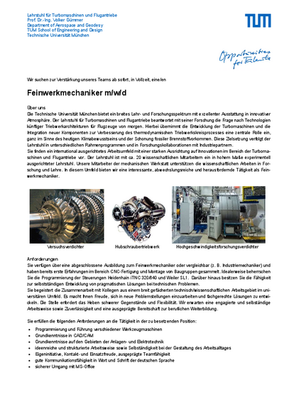 Der Lehrstuhl für Turbomaschinen und Flugantriebe sucht immer wieder wissenschaftliche Mitarbeiter/-innen zur Bearbeitung von Forschungsprojekten im Bereich der Flugantriebe und Turbomaschinen. Wenn Sie Interesse an einer Promotion und einen überdurchschnittlichen Universitätsabschluss mitbringen, schicken Sie bitte Ihre Initiativbewerbung in elektronischer Form an bewerbung.ltf(at)ed.tum.de.